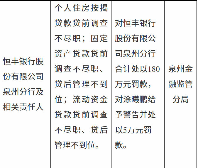 12月31日,泉州金融监管分局行政处罚信息公示表显示,恒丰银行股份有限公司泉州分行及相关责任人因个人住房按揭贷款贷前调查不尽职;固定资产贷款贷前调查不尽职、贷后管理不到位;流动资金贷款贷前调查不尽职、贷后管理不到位被合计处以180万元罚款,涂某鹏被警告并处以5万元罚款。