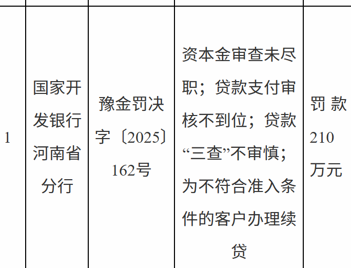 12月31日,国家金融监督管理总局河南监管局行政处罚信息公示表显示,国家开发银行河南省分行因资本金审查未尽职;贷款支付审核不到位;贷款“三查”不审慎;为不符合准入条件的客户办理续贷被罚款210万元。徐某鹏被警告并处罚款5万元;王某、杨某娟、董某元被警告。